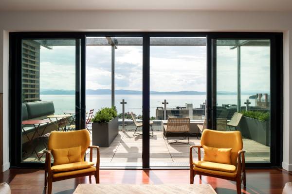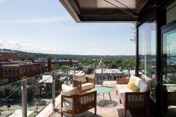 Building amenity's include a 9th floor community terrace featuring stunning views of the Adirondacks and lake Champlain. Terrace offers a fire pit, soft seating, bbq, pizza oven, and more. Bike storage and gym included.