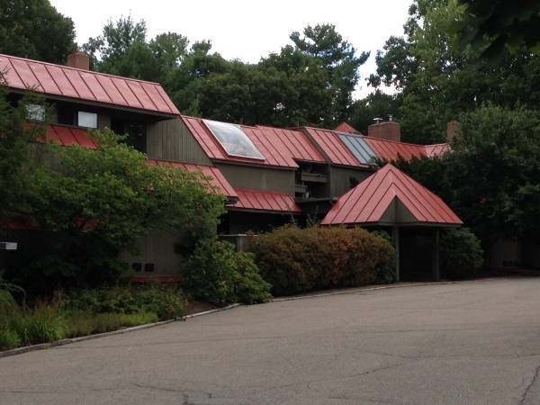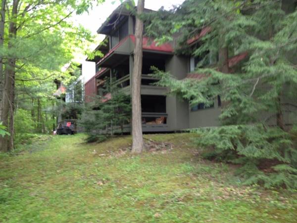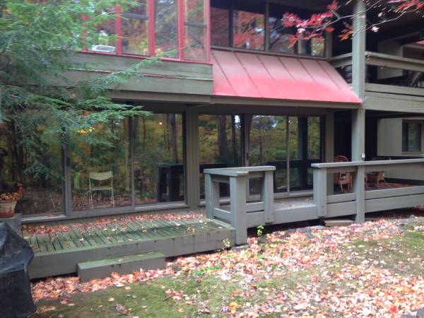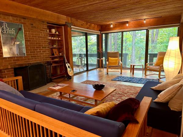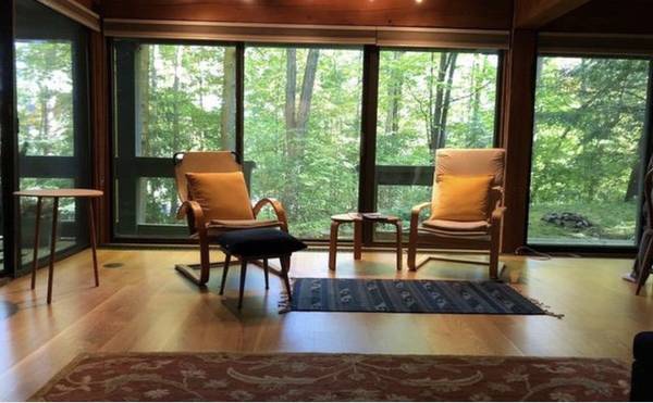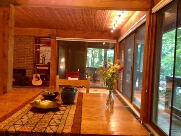 contemporary architect-designed; post &beam; hardwood floors, rustic wood ceilings; track lighting throughout; off-street parking; outdoor deck and patio, floor to ceiling windows look out on to a gorgeous forested setting; washer/dryer in unit.