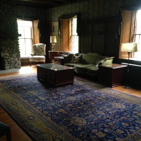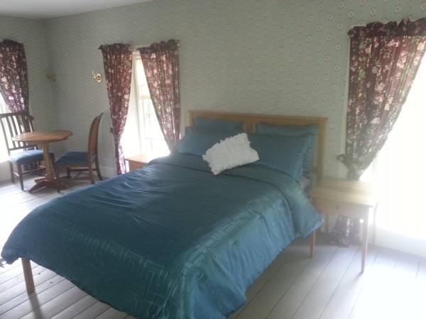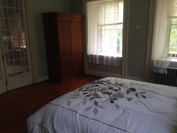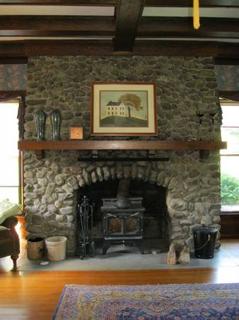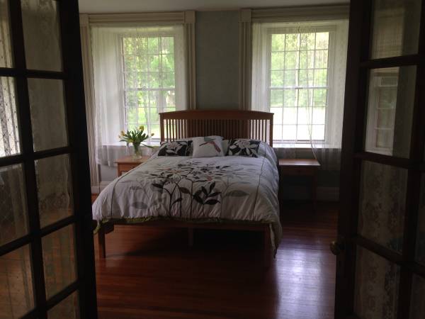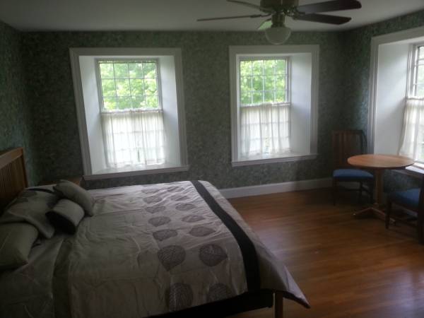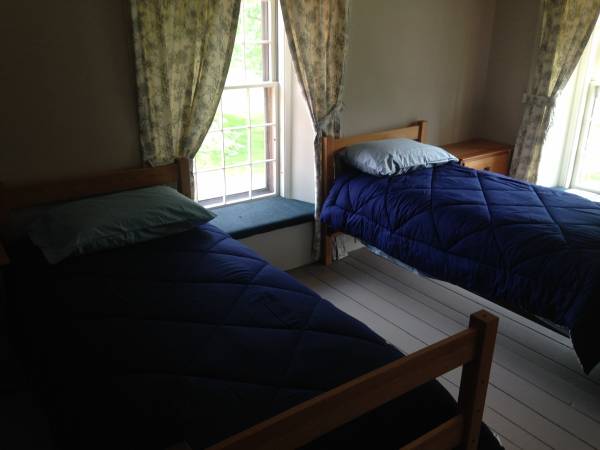 Five Bedrooms/ 3 bathrooms 2 Queen Beds, 1 King Bed, 3 Twin Beds and one full. Large Master Bedroom with private handicapped accessible shower/bath. Two more bathrooms, 1 with shower, one with claw foot tub and shower. Furnished living room with stone fireplace and wood stove inset. Sitting Parlor/ Birding Room next to dining area. Wireless Internet access throughout home. Modern eat in kitchen. Dining seats 12 indoors and screened in back porch for outdoor dining. Ample lawn space and perennial flower gardens. House is well insulated (walls are 2 feet thick) Oil steam heat (recent new boiler). Renter pays utilities. Furnishings provided Grounds will be maintained by owner. Renter pays for snow removal.