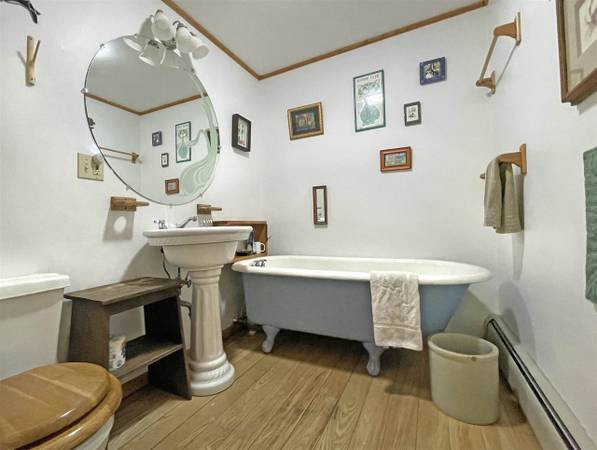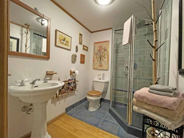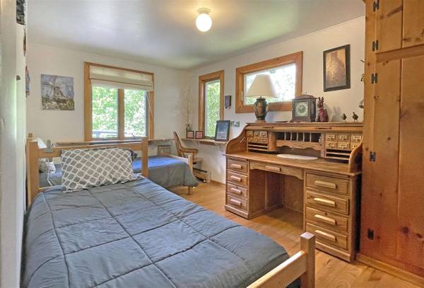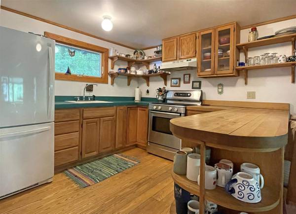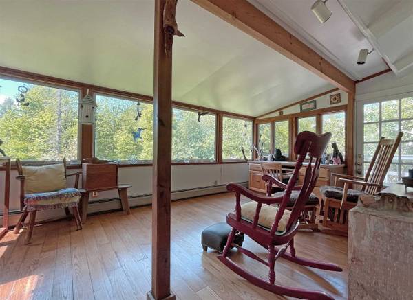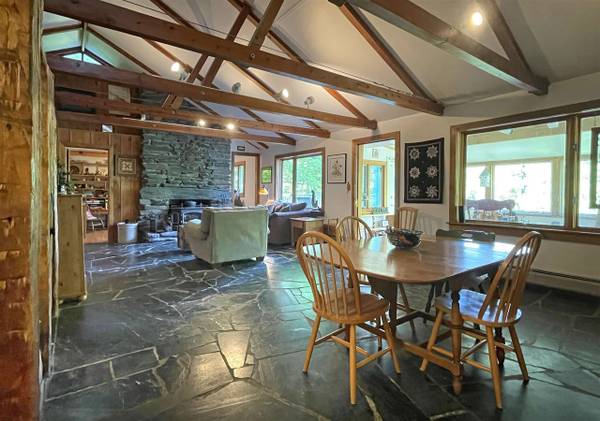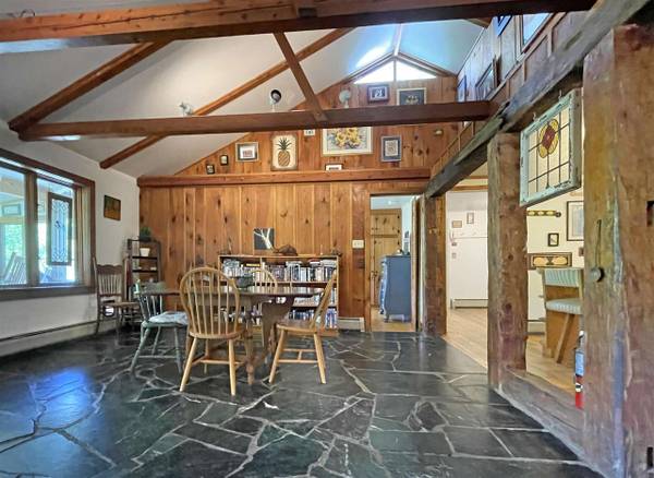 Experience peaceful mountain living on over 9 acres featuring a charming single-level post and beam bungalow with vaulted ceilings and exposed beams. The open floor plan includes wood and stone flooring, a cozy wood stove in the large stone hearth, and a spacious sunroom opening to the back deck. The primary bedroom offers an en-suite bath with a clawfoot tub, complemented by a den, office, and additional bath. A separate finished structure with bath and potential kitchen space has served as a studio, plus there’s a greenhouse, artist cabin, shed with wood storage, and carport. Owned solar panels power a backup battery system. Enjoy outdoor living with trails, a brook, fenced pet area, and a landscaped yard perfect for sledding. Just minutes from ski resorts, this tranquil retreat offers the perfect blend of comfort and nature.