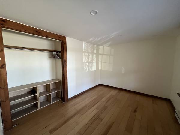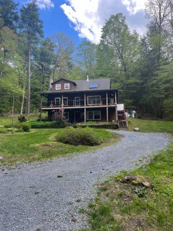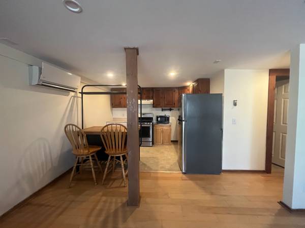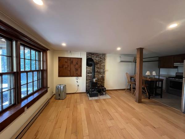 The apartment has its own entrance, covered porch, hardwood floors, a small woodstove, shower, deep bathtub and gas kitchen stove, and access to washer/dryer (shared with owner who lives upstairs). Newly installed, cold weather efficient heat pump/mini split provides heat in winter and a/c in summer. Pets welcome.