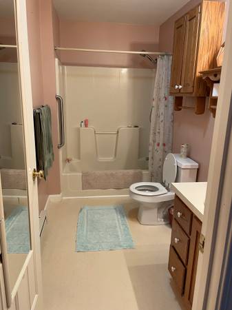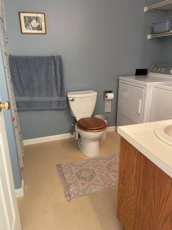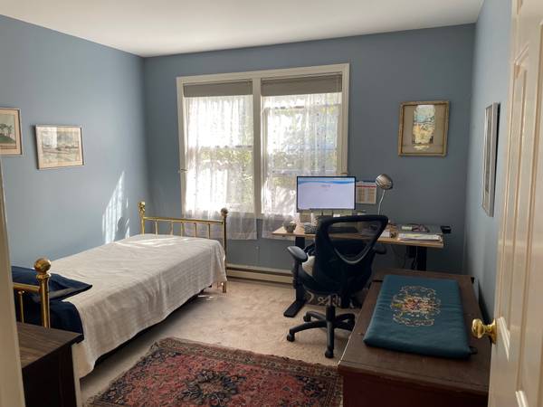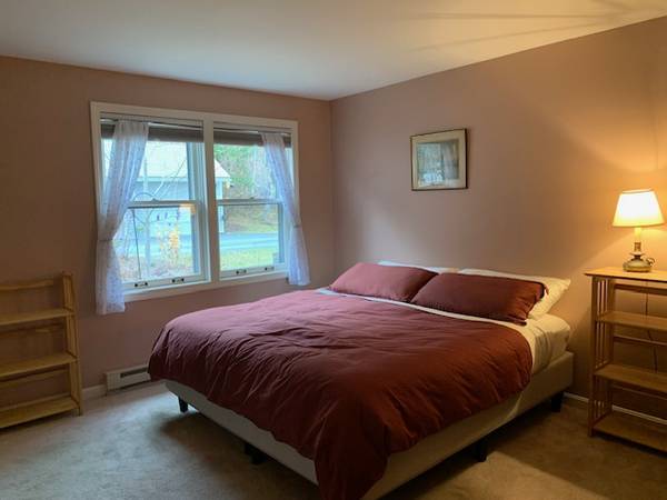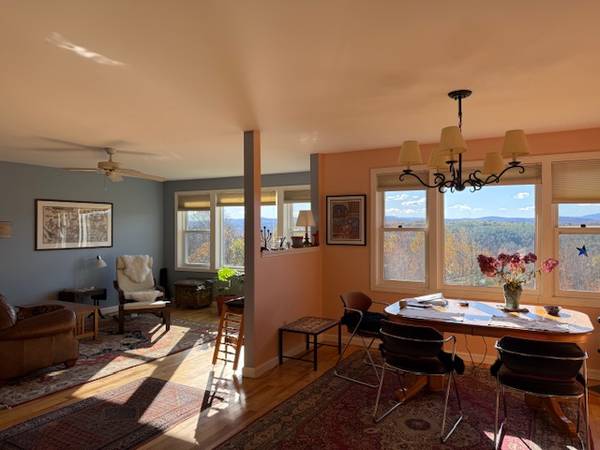 Furnished 2 bedroom, 2 bath condo with stunning views and open layout on a single level (no stairs) in a friendly quiet neighborhood in Montpelier. One year lease minimum, $2450 plus utilities. Water/sewer/garbage and plowing are included in rent. Garage and one outdoor parking space included. There is an electric car charging station, an outdoor swimming pool and 2 tennis/pickleball courts with basketball hoop on the property. Built in bookshelves/cabinets and fireplace (not functional) in living room. Table for 6 in dining room. King-sized bed in master bedroom, and 2 closets. Second bedroom has twin bed, 1 closet. Work table available to be placed as desired. Table for 4 on small deck with views. Washer/dryer in second bathroom. Wood floors in living/dining and hall areas; carpeting in bedrooms. Heat pumps for heating and cooling, and back up propane heater.