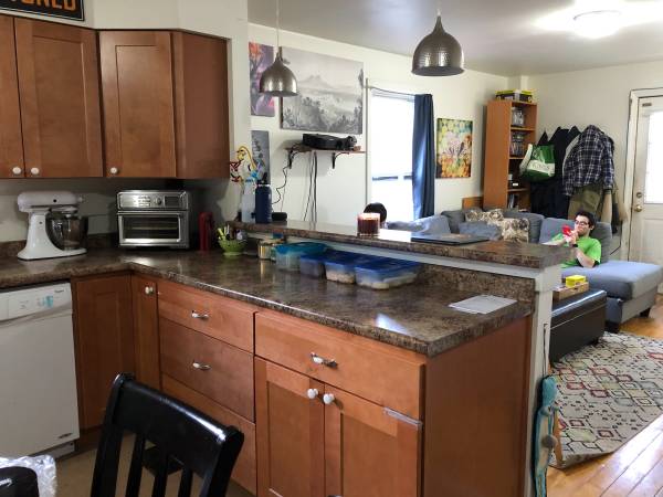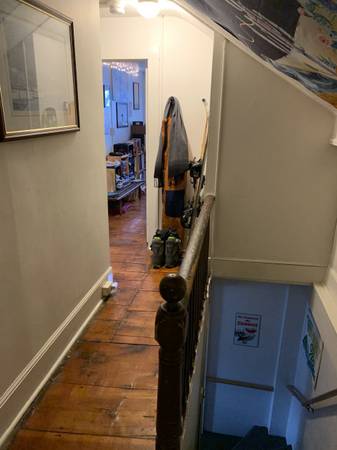 Quiet 4 bedroom apartment is an easy walk to downtown Winooski, UVM and Hospital. Recently renovated, this sturdy, early 1900's apartment features hardwood floors, free washer and dryer, dry basement storage, a good-sized kitchen with large fridge, dishwasher, updated cabinets and counter, and breakfast bar. There is a full bath downstairs and 1/2 bath upstairs. A bus stop is just steps away, the busline runs right past the Medical Center, UVM and straight into downtown Burlington. Off street private parking is provided onsite for 6 cars total (for 2 apartments), and it backs up to a small bit of forest running down to Riverside Ave above the Winooski River Salmon Hole. Winooski restaurants are a 5 minute walk.