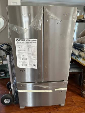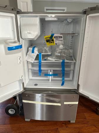 Brand new, never plugged in. Bought the fridge and had it in the garage for 3 weeks. Brought it into the house only to realize there are a few dents in the front door and it cannot be returned. See pics. Pricing well below retail. Feel free to reach out with questions. The handles are removed in order to get it in the door. I have all of those and they are in perfect condition. $1200 OBO. Thanks for looking