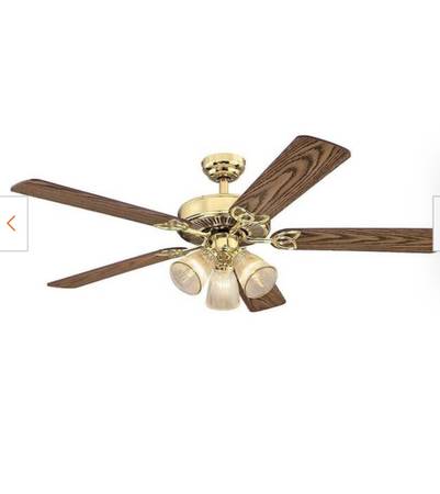 Polishes brass and walnut 54in ceiling fan with glass shades. Originally $174