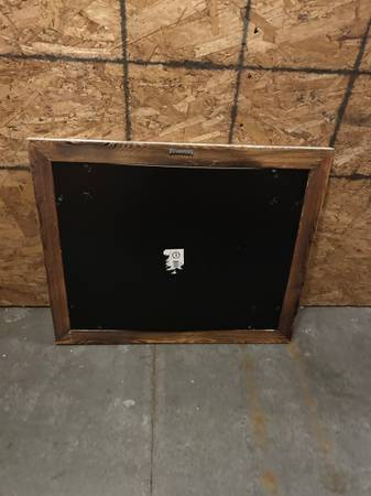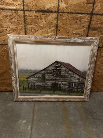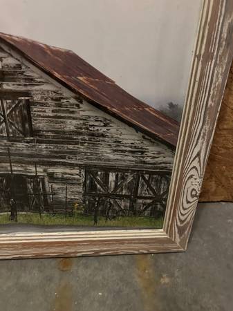 The distressed wooden frame perfectly complements the farmhouse aesthetic of the artwork. Frame measures 23 inches wide by 20 inches tall. Great condition with proper backing and hanging hardware included.