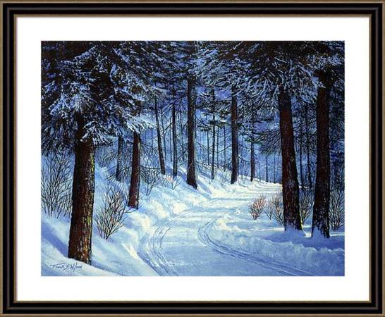 My son and I went cross country skiing deep into Groton State Forest in Vermont and on our way out I turned to see our tracks in the late afternoon light. I started this painting right away when I got back to the studio while the memory was still fresh like the snow.