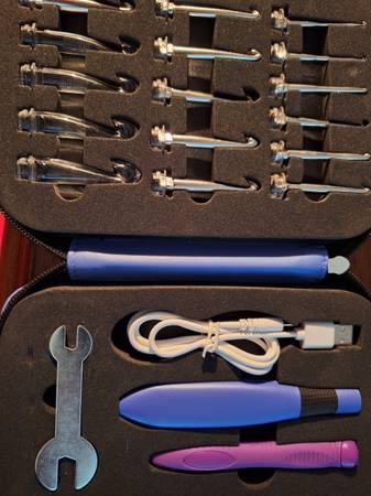 New in case. Light is great when working with dark yarn. Comes with 2 hooks; one is manual and the other is USB driven. Free shipping.