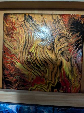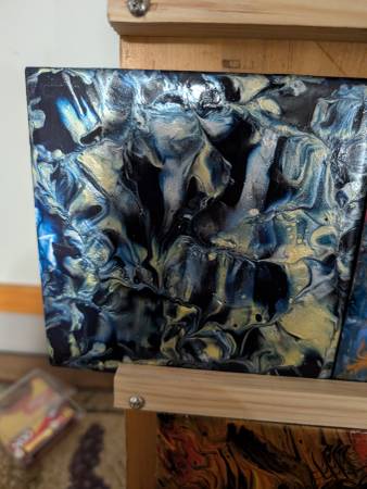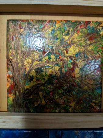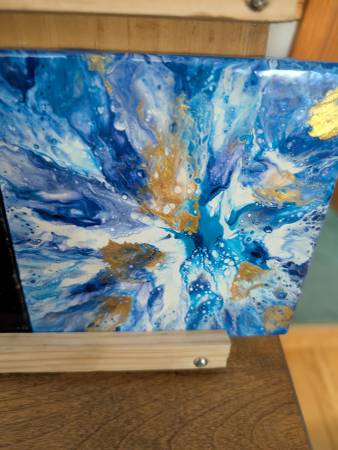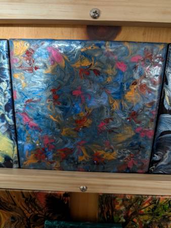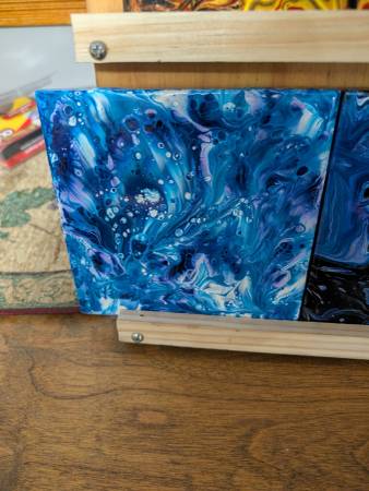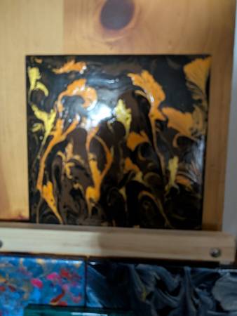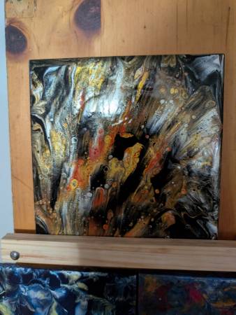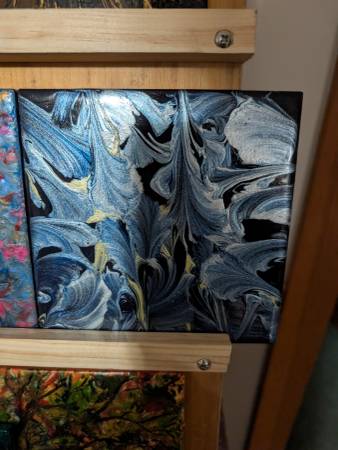 Trivets abstract paintings on 6 X 6 inch tiles, with cork backing. Each trivet is $15.00. Coaster set of four abstract paintings with snow flake designs on 4 X 4 tile. $25.00 for set, not sold...