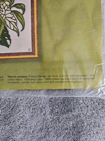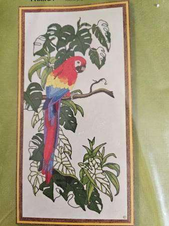 Vintage 1978 colorful parrot embroidery set, complete with yarn and needle, package never opened.