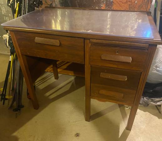 Beautiful, fully refinished and functional wooden desk from circa 1940. Comes with removable plexiglass top cover.