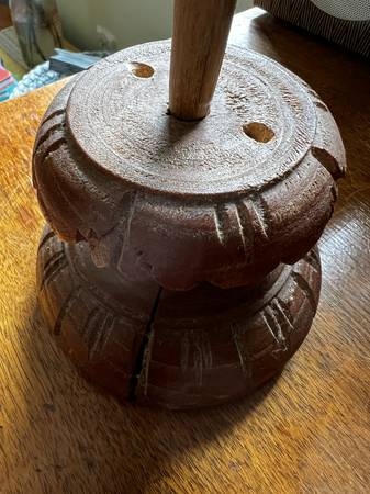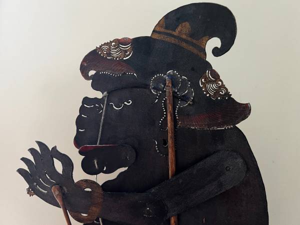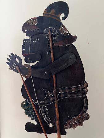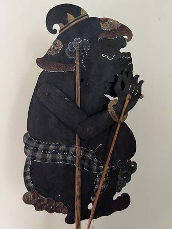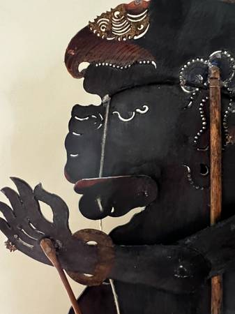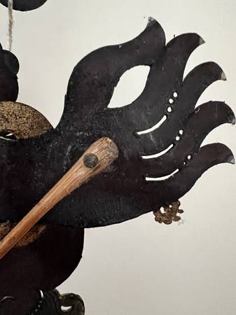 This monkey god travelled all the way from the island of Bali where he was used in shadow theatre, known as Wayang Kulit, which utilizes elaborately crafted leather puppets to tell stories drawn from Hindu epics like the Ramayana and Mahabharata. This traditional art form is accompanied by gamelan musi. Hanuman is a revered Hindu deity, often depicted as a monkey, known for his exceptional strength, devotion to Lord Rama, and selfless service. He is a central figure in the Ramayana, one of the two major Sanskrit epics of India. Hanuman is celebrated for his courage, loyalty, and unwavering faith, making him a popular and beloved figure in Hindu mythology. This Hanuman is an authentic vintage puppet used in Wayang Kulit on the island of Bali. $100 or make an offer!