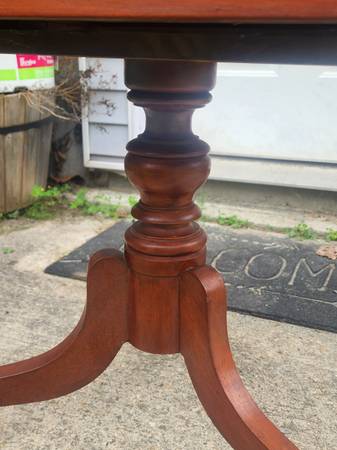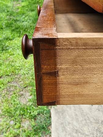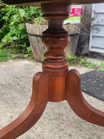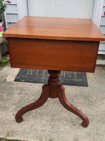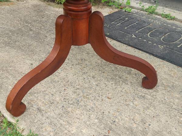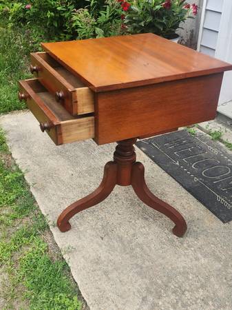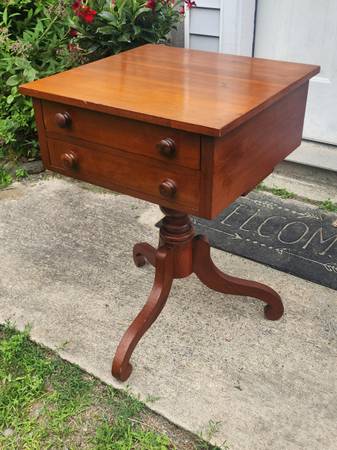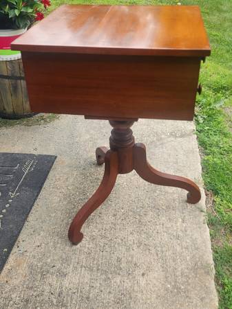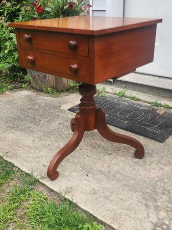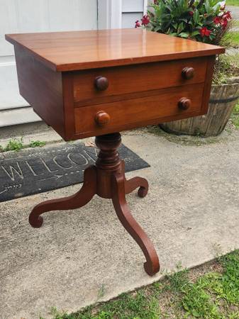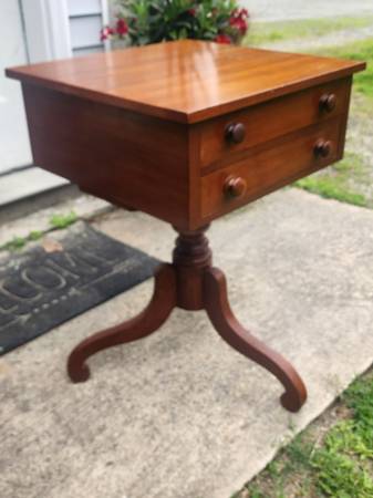 Beautiful early antique Empire mahogany stand featuring hand cut dovetail drawers, a dovetailed case, and a finely turned center pedestal resting on curved legs - it's a beautiful stand! Dimensions: 19" wide x 18.5" deep x 26.5" tall. $165 cash, fcfs, no holds.
