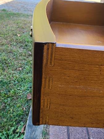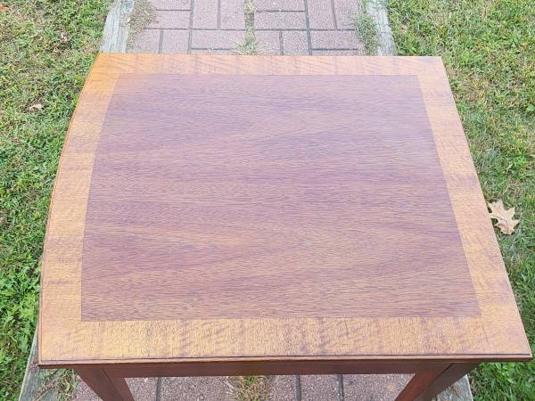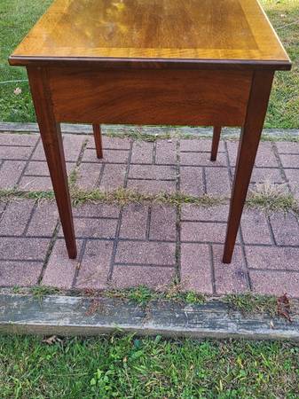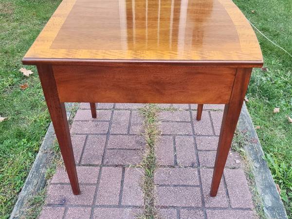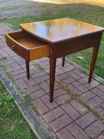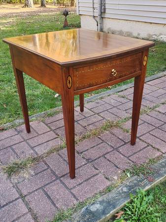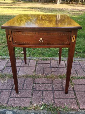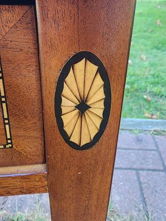 Exceptional vintage mahogany bowfront stand with one deep dovetailed drawer that has a fantastic inlaid detail around the perimeter of the drawer front and a beautiful inlaid fan detail at the top of each front leg. The drawer's secondary wood is red oak and the stand rests on tapered legs - just a classic looking stand of utmost quality and craftsmanship. Dimensions: 22" wide x 26" deep x 25" tall. $235 cash, fcfs, no holds.