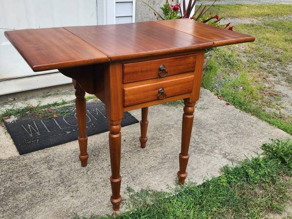 Gorgeous vintage solid mahogany drop leaf stand with two drawers and nicely turned legs. As shown in the pictures, it's in excellent condition. Dimensions: 18.75" wide with leaves down (35.25" with leaves up) x 18" deep x 28" tall. $125 cash, fcfs, no holds.