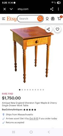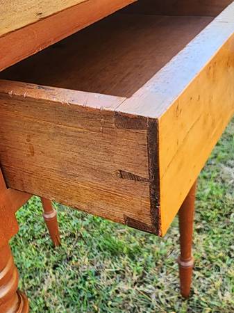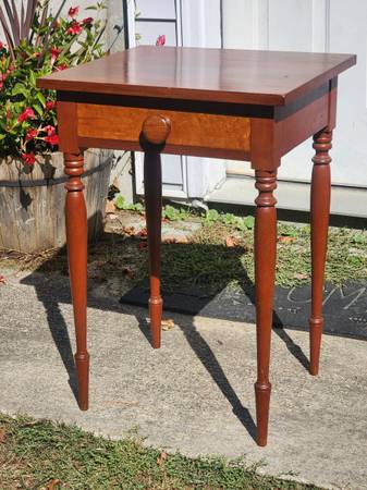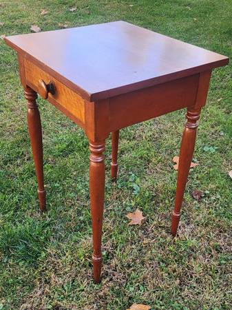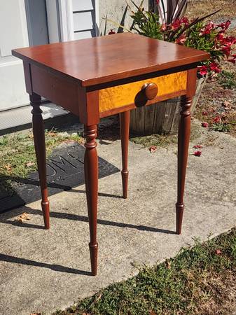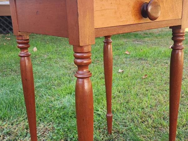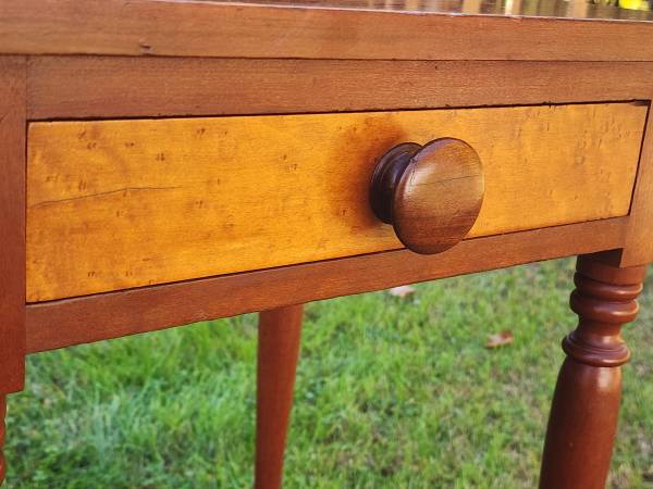 Wonderfully proportioned 1800's solid cherry stand that features a single drawer with a birdseye maple front, fine hand cut dovetails and beautifully turned legs. Dimensions: 19.75" wide x 17.5" deep x 28.5" tall. $185 cash, fcfs, no holds.