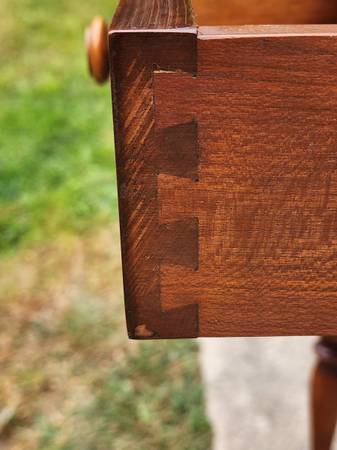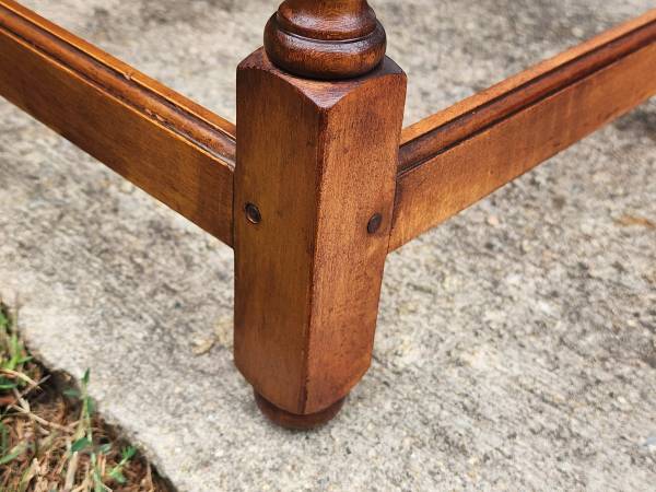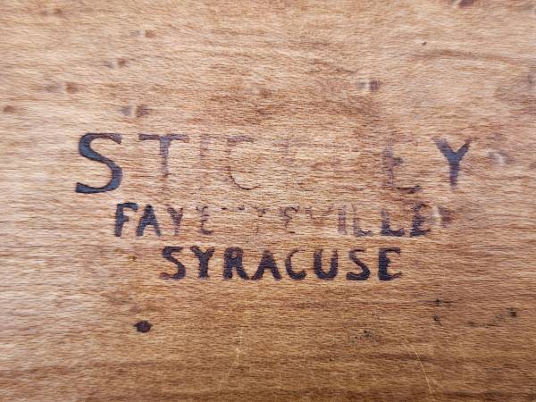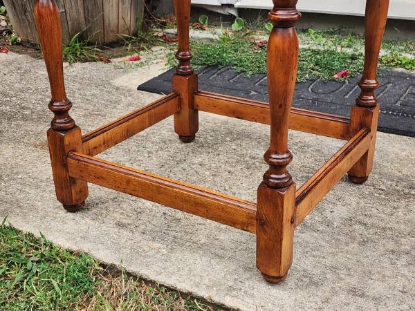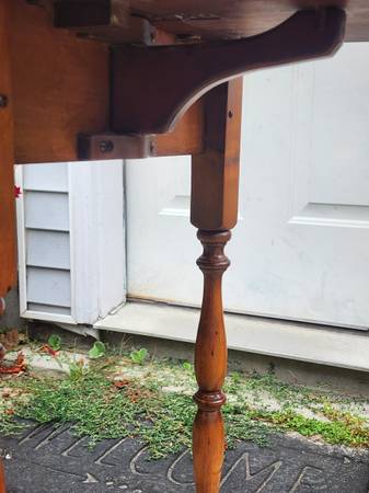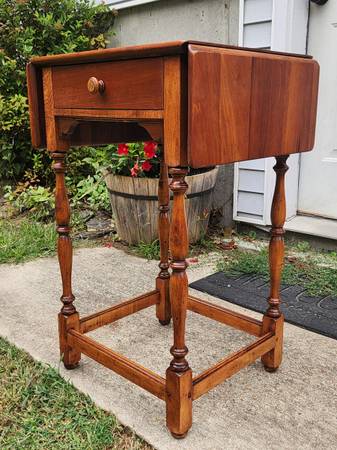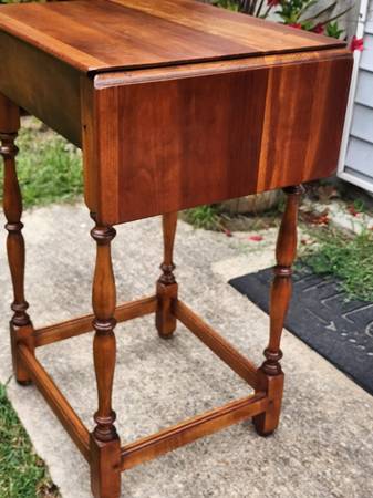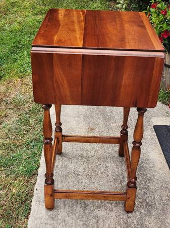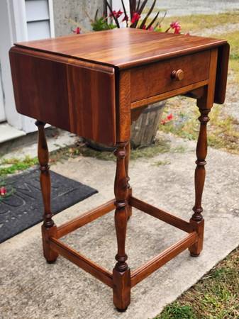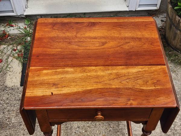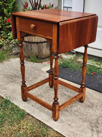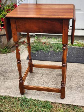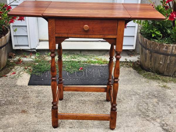 Vintage solid cherry Stickley single dovetailed drawer drop leaf stand with mortise and tenon pegged joints, nicely turned legs that are tied together with a stretcher base. The stand is in very good condition. Dimensions: 19.25" wide with leaves down (32.25" with leaves up) x 16" deep x 29.25" tall. $225 cash, fcfs, no holds.