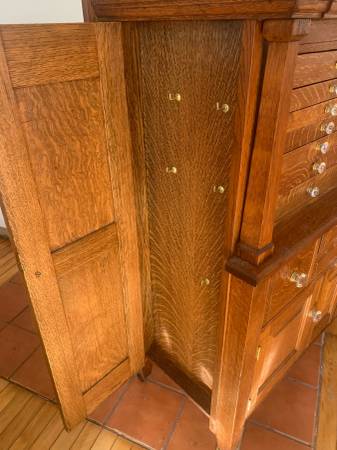 Fantastic restored antique, quarter sawn oak dental cabinet made by the American Cabinet Company in 1913. 18"D x 41"W x 63"H $2500