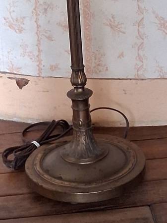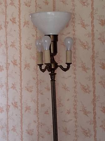 Nice, heavy, old floor lamp. Ready to use. You can run 1 light 2 lights or 3 lights. Or you can use the center light that shines up. The shade is in good shape. $40. CASH ONLY PLEASE. If it's still...