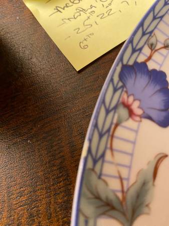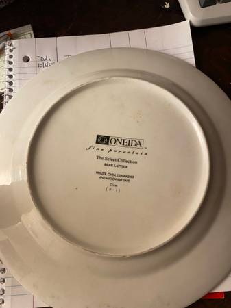 Oneida Fine Porcelain Blue Lattice Dinner Plate 10 1/4 inch. 1/4 inch chip see photo. Otherwise very good condition.