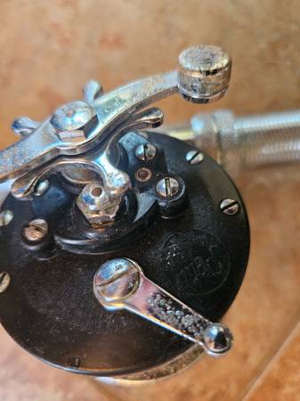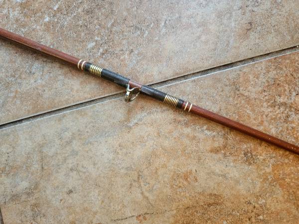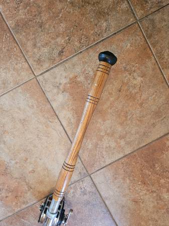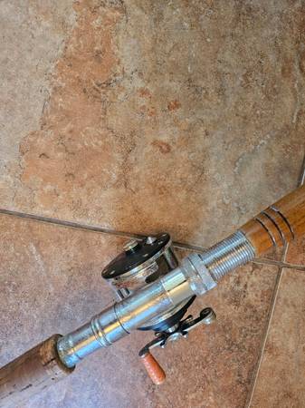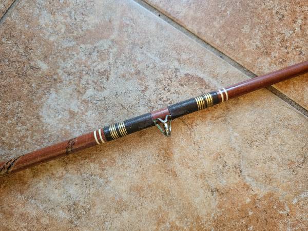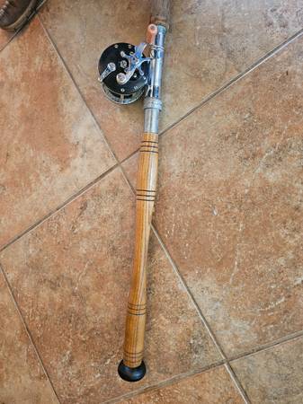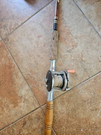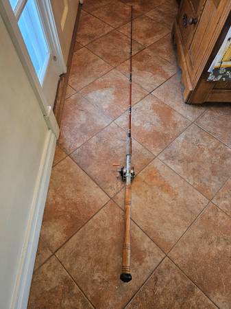 Mohawk Deluxe Ocean Pride 7' fishing rod (2 piece) with chrome plated stainless steel guides. Rod is made from Scotch ply epoxy fiberglass by 3M Co. In good condition and has a wooden handle. Comes...