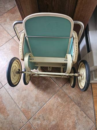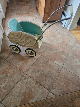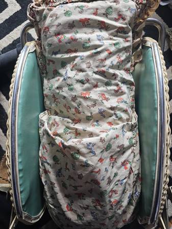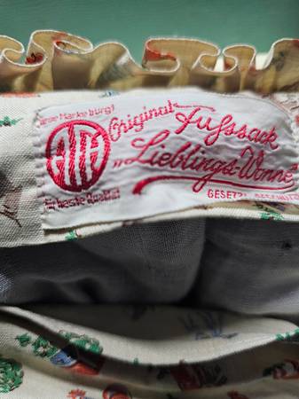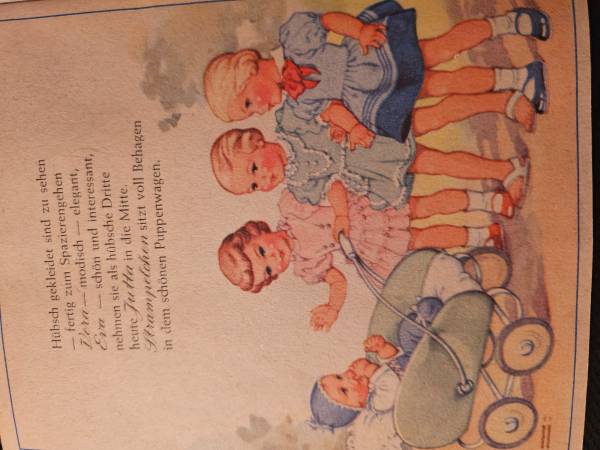 German made by Hecker, this vintage doll stroller has wicker panels, adjustable head and foot tray, foldable handle for easy storage or transport. There is a children's book all in German that features many of the vintage dolls and has the stroller on display. Finally, there is a doll sack original by Lieblings-Wonne. See photos.