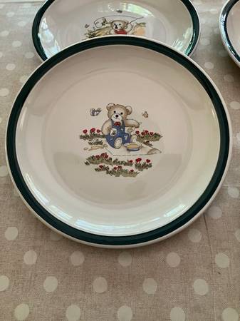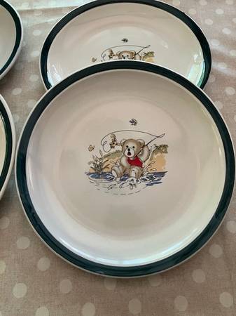 Set of 4 stoneware plates with teddy bear scenes. One features a teddy bear having a picnic; the other 3 show a teddy bear catching a fish.
