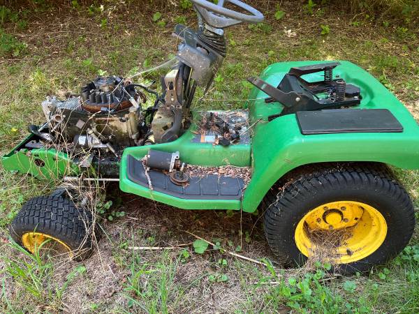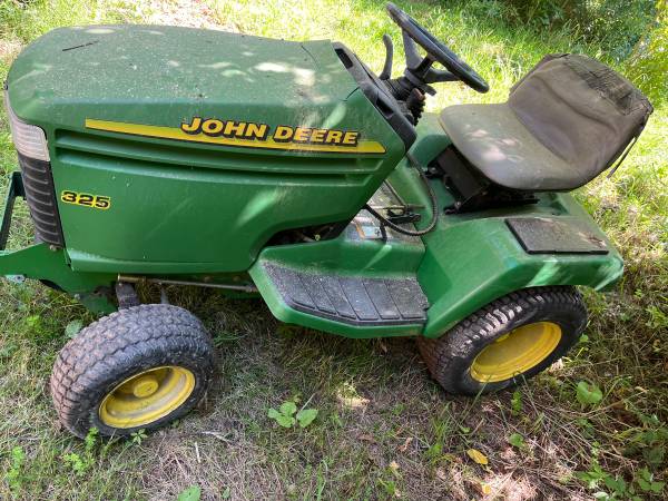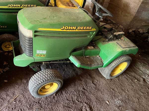Lot of John Deere 325 garden tractors. These have hydraulic lift and power steering. One was in running condition before front tire stopped taking air just over a year ago. Other 325 developed a bad pto seal and another chassis is strictly for parts. Comes with 3 decks: a good 48β, 54β, and another 48β that the shell is rough. Hoods have cracks but still function as they should.
