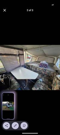 Coleman pop up camper about 26 feet when open. Heater works great not sure about the water I haven't tried it. Canvas has a couple small patches but is water tight. Tires are good, tows great would like to get 800 but NEED GONE ASAP so any reasonable offer will be accepted. Can call or text 8zero2 six2four 6four0nine for more info.