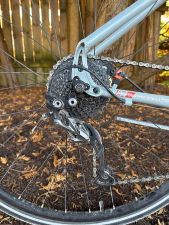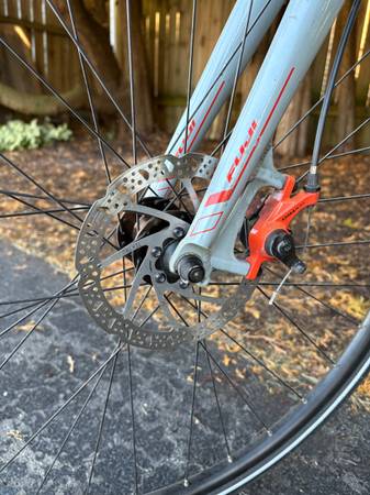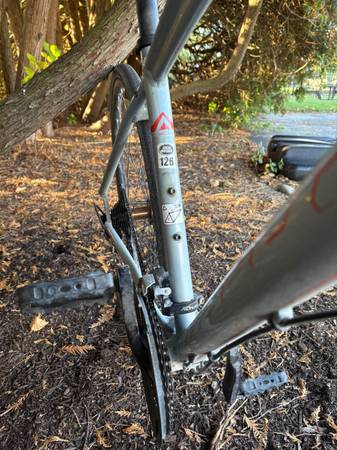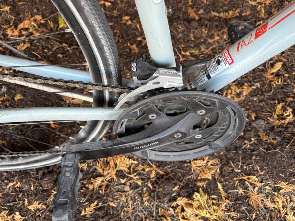 Fuji 1.7 hybrid bike. A2 aluminum frame. Shimano Altus/Alivio 3 x 7 speed drivetrain. 700c wheels. Tektro mechanical disc brakes. Seatpost measures 17", top tube measures 21"