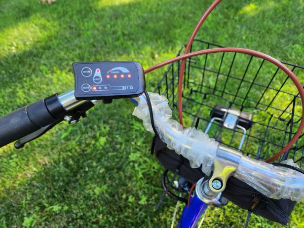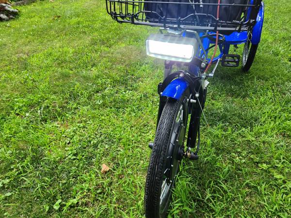 has a powerfull 48 volt system that will go approximately 35 MPH, and will climb hills with ease. The front basket folds easily, so you can carry groceries or a picnic basket or whatever you wish, just strap it down. It has a nice BRIGHT LED headlight that is integrated into the system with no extra batteries needed to operate it. You could take a SWEET SMOOTH ride with your mother in law, handicapped love one or strap a baby car seat securely to the rear WIDE seat. The 22 inch wide backseat lifts up to access a convenient basket to also carry items to go have a picnic or whatever you wish to put in . It has a long life 5 star , 14 AH , lithium ion battery that will go aprox 30 miles , depending on your weight and the terrain . This ETRIKE can be pedaled like a normal bike. It can be very fun just taking the spouse along for a ride or a picnic somewhere , also great for campgrounds. 450 lbs is the total acceptable weight limit . The best thing about this ETRIKE is that you can't get trouble for having too much fun! Hurry ! No trades for goats , boats , cows, pigs , chickens or anything, sorry !