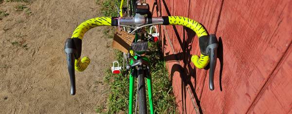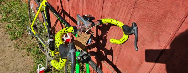 Its got one of those weird speedometers that has TWO censors one on the pedal and one on the rear wheel vs todays versions with one on the front wheel. But the batteries are probably dead because the read out didnt come on when I turned the wheel.
