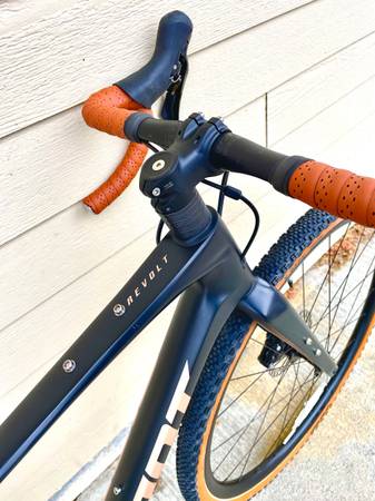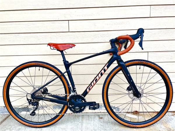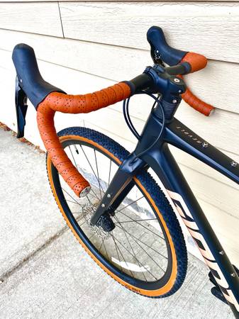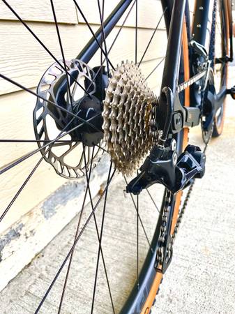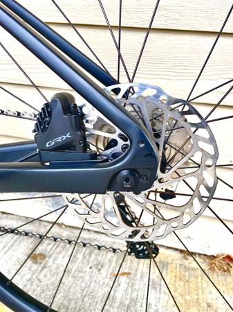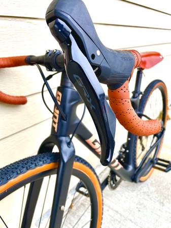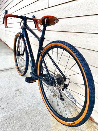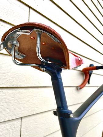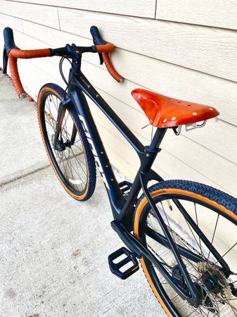 Xs “advanced composite” carbon fiber frame with Thudbuster seatpost design for an extra comfortable ride. 2x10 Shimano GRX drivetrain with 32/48t FSA crank and 11-34t cassette. GRX hydraulic disc brakes have fantastic stopping power in all weather conditions. New genuine rawhide seat, it is a surprisingly well made copy of a Brooks B17 seat. Xs frame should be a good fit for riders 4’10”-5’3”.