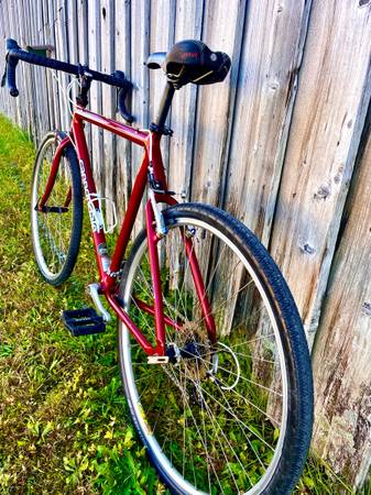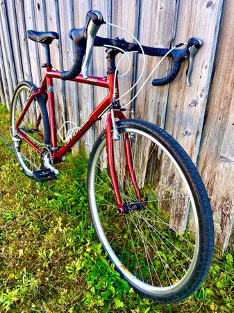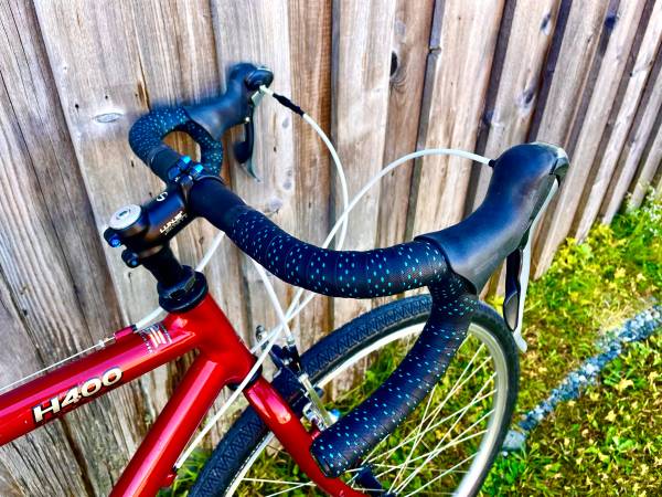 Lightweight H400 aluminum frame with a chromoly fork. 2x10 Shimano drivetrain with Tiagra shifters, Deore RD, new 11-34t cassette and a new chain. V-brakes with new pads and new stroke converters have excellent stopping power. 700x38c Bontrager tires in very good condition, the frame/rims could accommodate tires as wide as 45c, maybe wider. 44cm Bontrager drop handlebars. New stem and all new cables/housings.