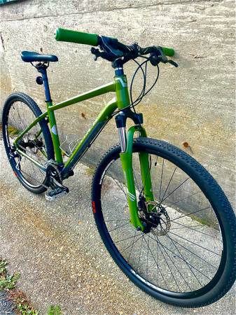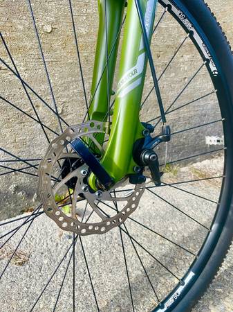 3x8 shimano drivetrain w/trigger shifters. Tektro mechanical disc brakes have excellent stopping power in all weather conditions. The suspension fork works very smoothly and features a very effective lockout lever. New 700x40c Bell gravel tires, new inner tubes, new brake cables and new lock-on grips.