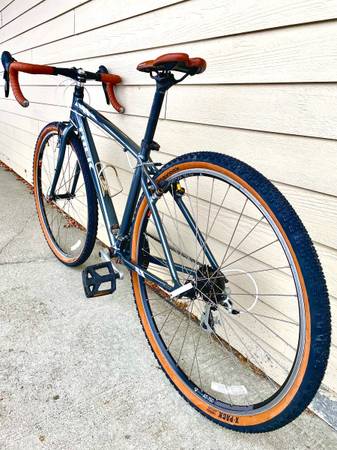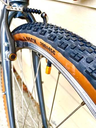 3x7 drivetrain with new Micronew shifters and Shimano derailleurs, shifts perfectly over a wide gear range. Dialed in V-brakes with new pads have excellent stopping power. New 700x45c OnTrack gravel tires, new 42c drop bars w/new wraps, new stem, new seat and all new cables/housings.