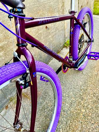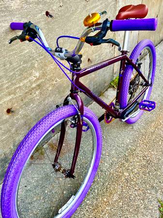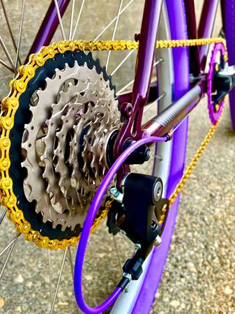 1x8 Shimano drivetrain with a rapid fire shifter, new 11-40t cassette, new 38t narrow/wide chainring, new Acera derailleur and a new chain. It shifts perfectly over a wide range, thanks to the big cassette, it can climb steep hills with relative ease. Deore LX cantilever brakes with Kool Stop pads and Avid brake levers have excellent stopping power. New 26”x2.25” cruiser tires, new seat, new pedals, new lock-on grips and all new cables/housings.
