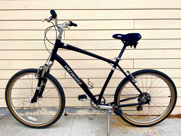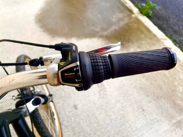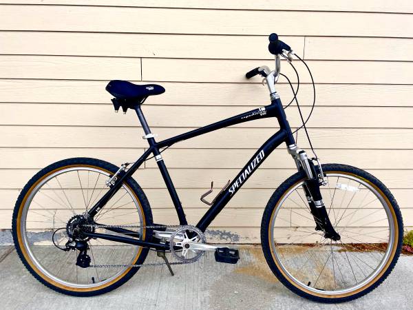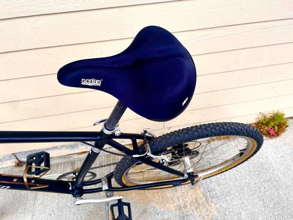 Lightweight aluminum frame w/suspension fork and Serfas gel seat make for a very comfortable cruiser. 7 speed Shimano drivetrain with grip shifter, powerful V-brakes.