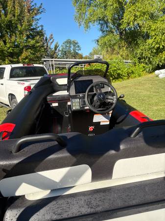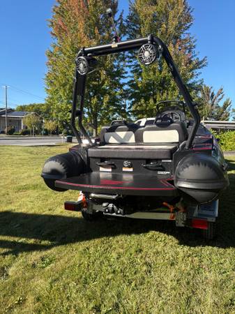 This is a compact yet powerful boat designed for family fun. It has a Fusion XS series speakers, comfortable seating and a roll bar that allows for skiing, tubing and other wake sports. The aluminum hull and Hypalon tubing gives this boat durability and a long lifespan.