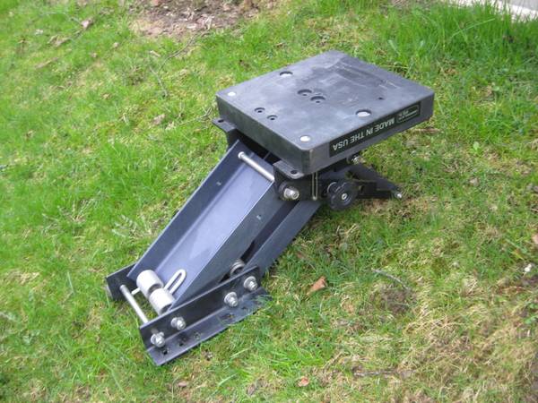 Adjustable motor mount, for auxarillly trolling motors by - The Garelick~"Eez In" is a HEAVY DUTY support, able to handle larger 4 stroke motors. Up to 35 hp or 260 lbs! Strong springs to help lift heavier motors. Locking knobs on both sides. Large plastic mounting board. Black anodized aluminum construction is lightweight, but rock solid. The span width of the bracket mounting holes= 8 1/2" center to center. There are 6 holes per side. Each one is 1 1/4" apart (vertically) There are 6 stainless steel carriage bolts included 3" long (with ss lock washer and nut) Amazon price $375.
