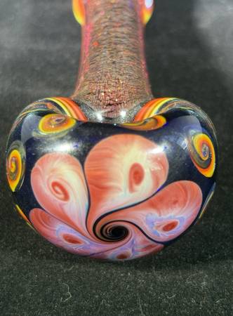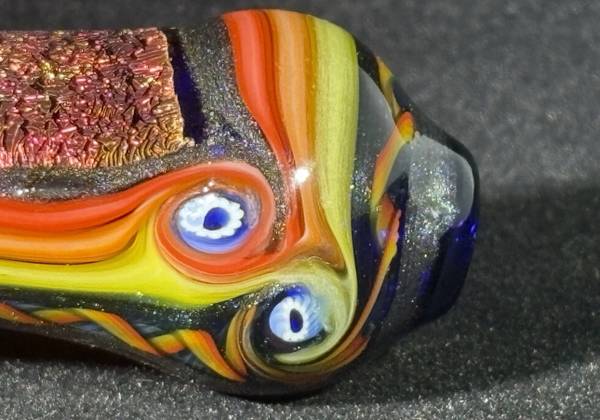 US artist Lab R from IN. Dichroic Specialists blowing glass since 1994. Orange/red "crushed opal" dichro on Cobalt in the neck with line work and red "flower" on the head. Approx 5" long and a heavy 101.5 grams