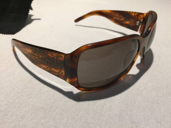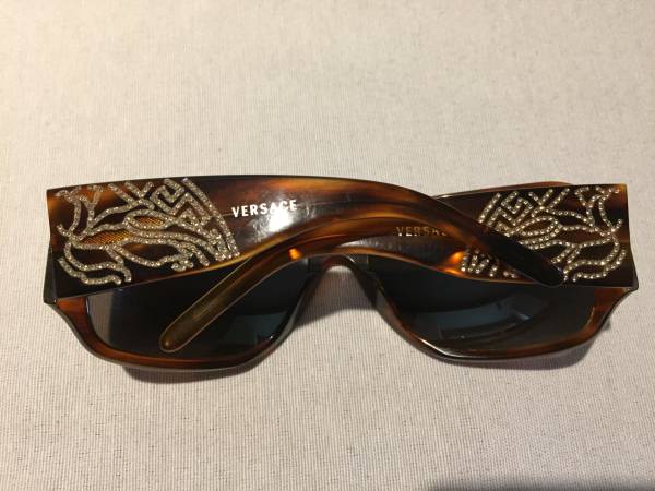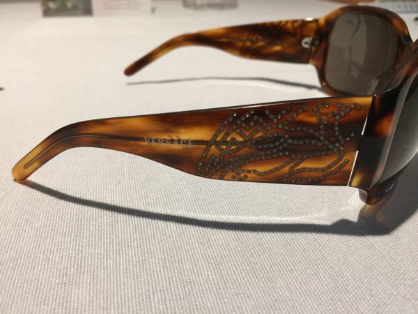 Tortoise shell pattern Versace sunglasses, embellished with signature Versace Swarovski crystal detailing and Versace logo on both temples.