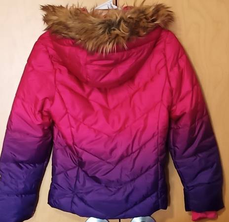 Brand new girls winter Puffer coat. Nice warm coat has soft insulation in hood, back and cuffs, attached hood with removeable fur, inside pocket, and 2 external snap pockets. Girls size 10/12
