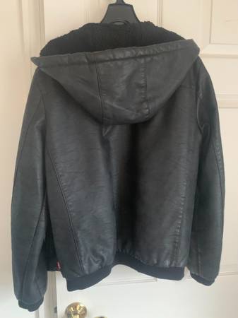 NEW! Levi's leather jacket Black, with Hood. Size Small for men. Lining is black wool, warm and cozy. Paid $185 + tax. Very cool hooded leather jacket, with wool lining, super warm and stylish.