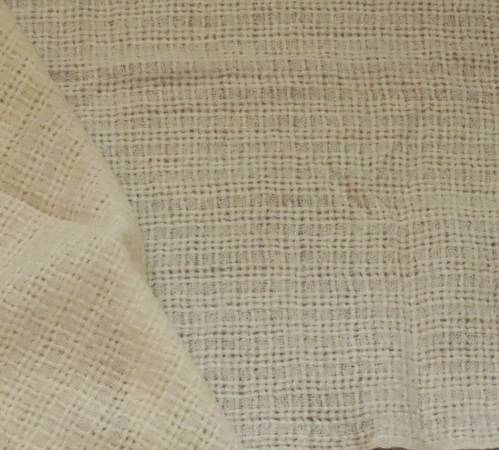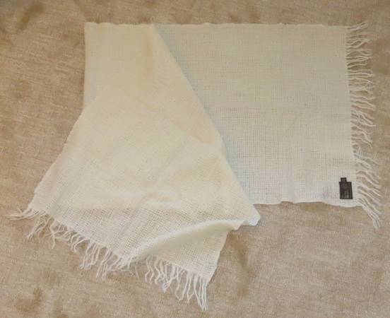 This is a handmade shawl, from Dunlap Weavers in Maine. It is 100% wool. A beautiful, soft woven pattern. It measures 24” wide and about 72” long, including fringe. There is one “imperfection” in the weave, and it is marked in the last photo.