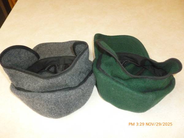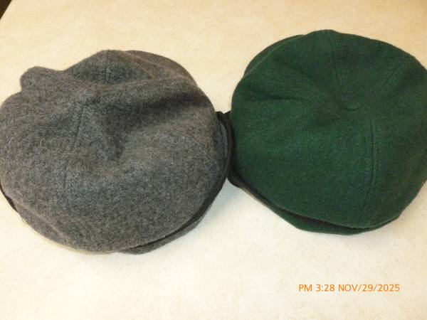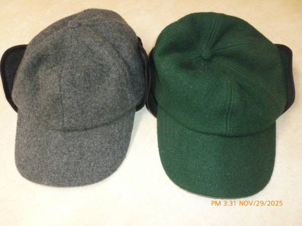 I have 2 pair of wool hats, which are 85% wool and 15%nylon. Both are x-large with fold down ear lappers. One is a Gray and the other is a dark green. Both have had very little use!! Asking $ 15.00...