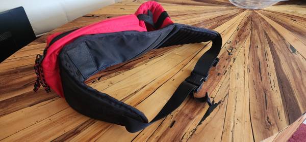Eastern Mountain Sports hiking, running, waist fanny pack. Padded with zippered pouch and bottle holder. Bright red, in excellent condition. Non smoking house.