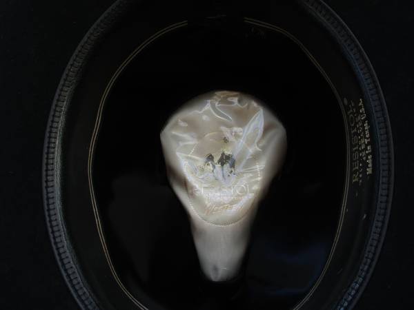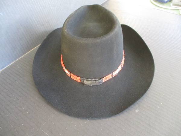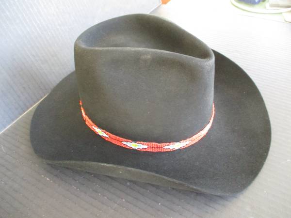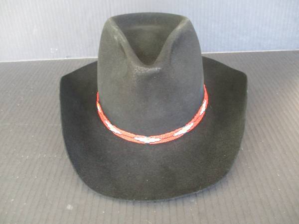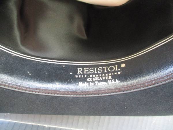 I've got an excellent quality and condition black cowboy hat in original box by Resistol. It was made in Texas, is size 7 3/8 and is high quality 4X beaver fur. It comes with a custom hand made beaded hat band. It's been warn but not abused, no odors, just slight wear to the highest points in front, as shown. It's about 15" from front to back and about 14" wide, 7" to highest point and has a 3.25" brim.