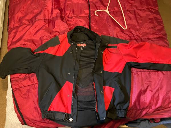 Motorcycle jacket, Poly/Kevlar shell. Kevlar on shoulders, arms. Many zippered vents. Zip out liner. Cuff and waist adjustments. X large. Excellent shape. $100