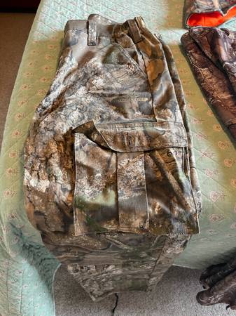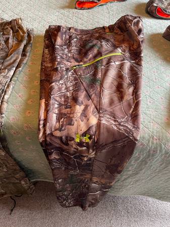 Selling camo hunting items. Realtree camo pants under armor scent control size lg stretch waste 25.00 /Mossy Oak Camo Coat with Hood size lg 42-44 30.00/ Realtree hunting pants size 32-34 25.00 / Huntworth Camo hood reversible one size 12.00 / Huntsworth Camo hat reversible one size 10.00 / Hot Shot hunting glove/mittens 10.00